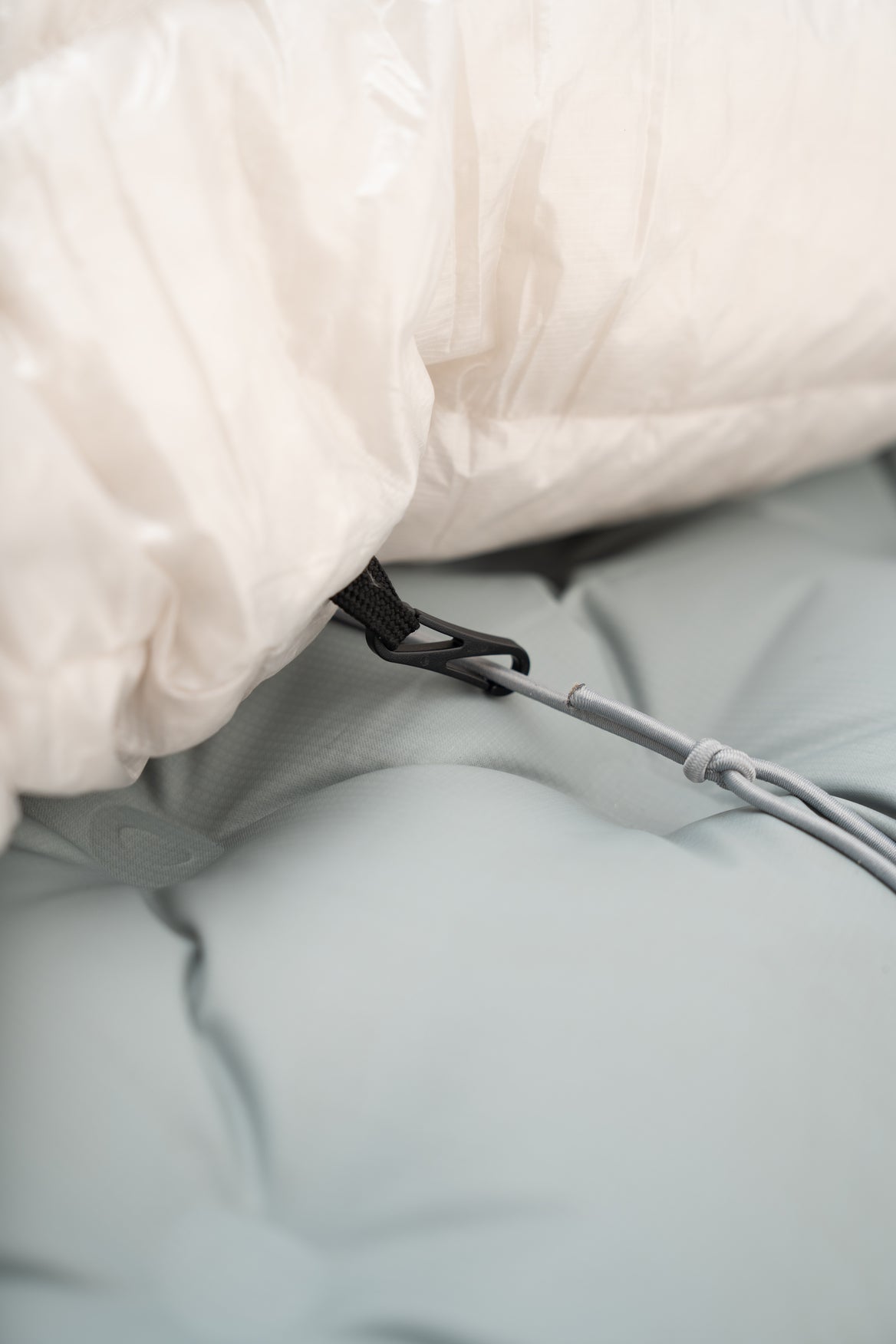 1. Put the 2 pad straps over your sleeping pad, one around where your hip will be and one where your shoulders will be. Ensure the 2 male clips on the strap are facing up.